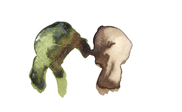 Gemellus signifie jumeau en latin. Deux figures anthropomorphes se font face et échangent un fluide par la bouche ; cet organe du visage devient le point où les pigments d’aquarelle se rencontrent et se mélangent.